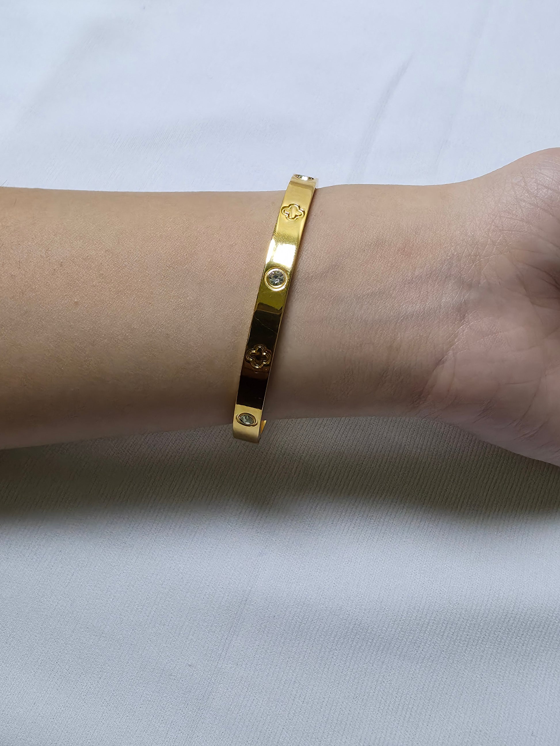 A touch of timeless elegance 🌸 — luxe bangles, gold plated jewellery, clover motif accessories, minimal statement pieces, waterproof jewellery, premium gifts for her.